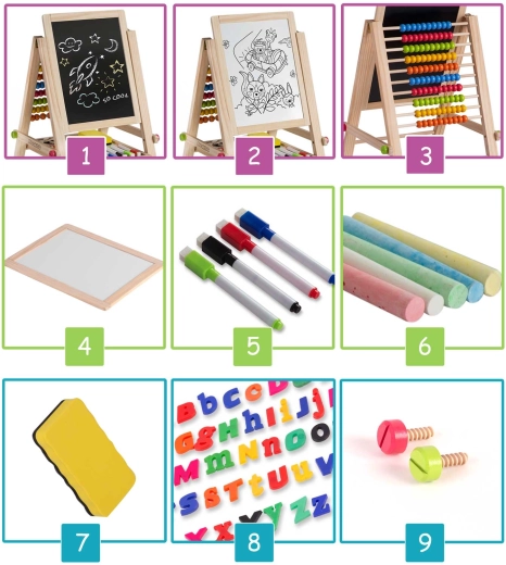 Incluye un práctico ábaco para practicar números y operaciones sencillas de forma lúdica, una pizarra extraíble para usar fuera del soporte y un equipamiento completo: tizas de colores, rotuladores borrables en seco, borrador y letras y números magnéticos. La pizarra se monta rápidamente sin herramientas y se transporta con facilidad.