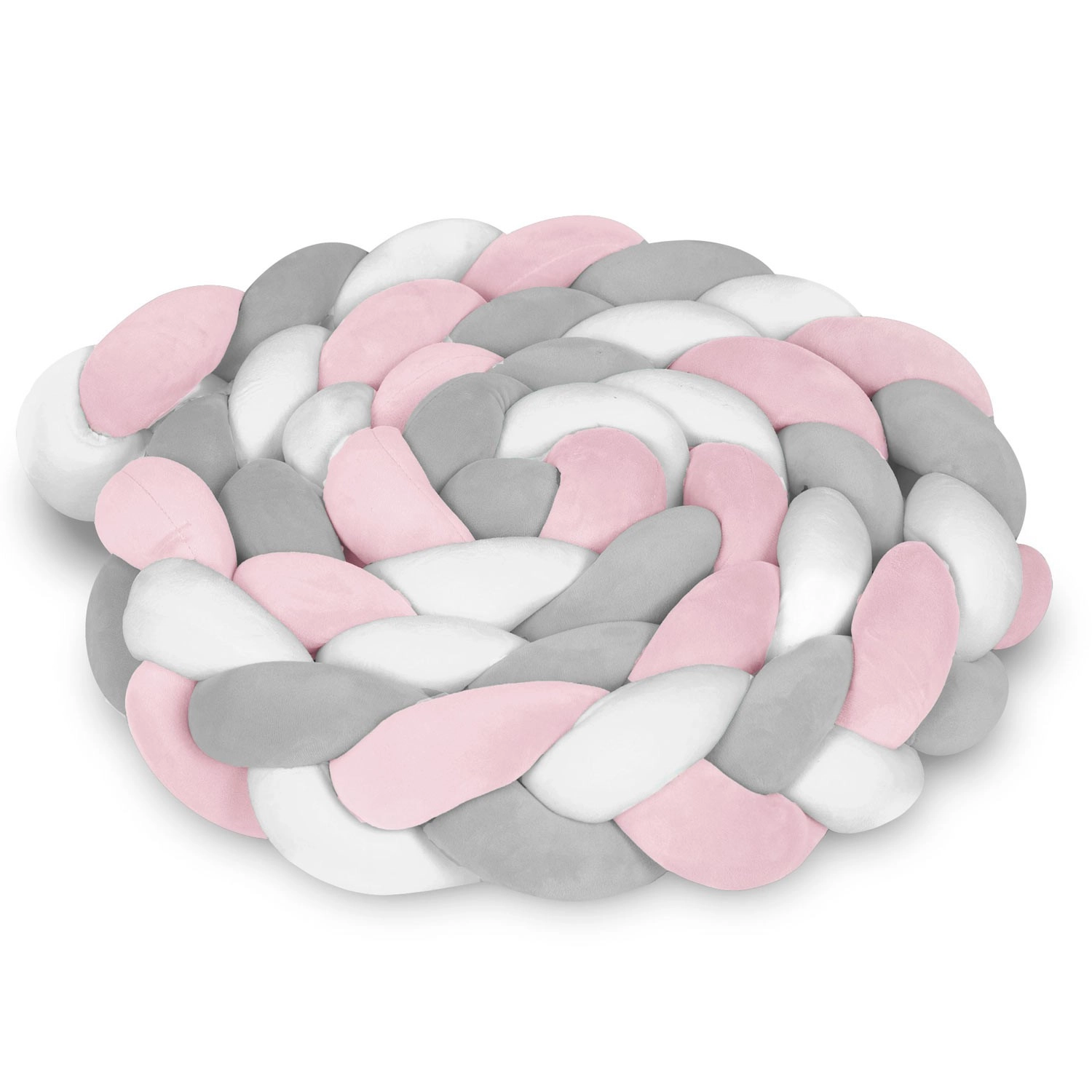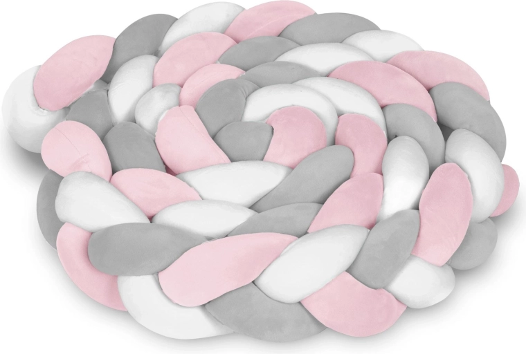 Protector trenzado para cuna infantil, suave y antialérgico, en una moderna combinación rosa‑gris que garantiza seguridad desde los primeros días, protege contra golpes con los barrotes y contra las corrientes de aire, y al mismo tiempo aporta calidez al cuarto infantil. Gracias a su longitud de 3 m y una altura de aprox. 11,5 cm, se adapta fácilmente a la cuna o al rincón de juegos y es agradable al tacto y fácil de mantener (lavado a 30 °C).