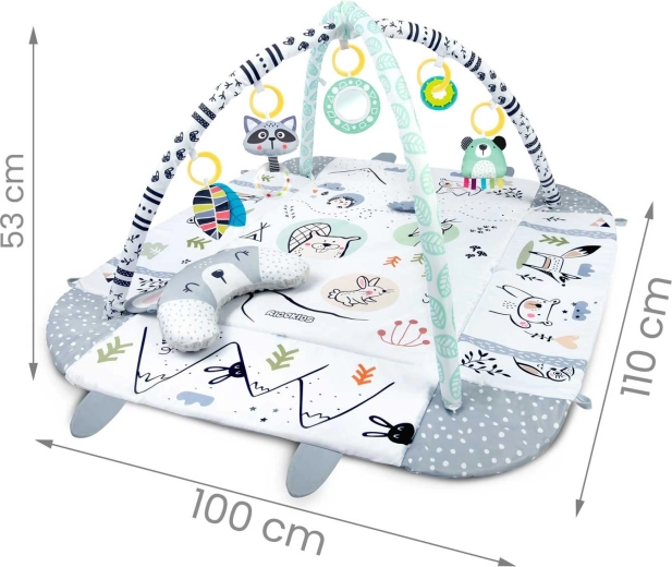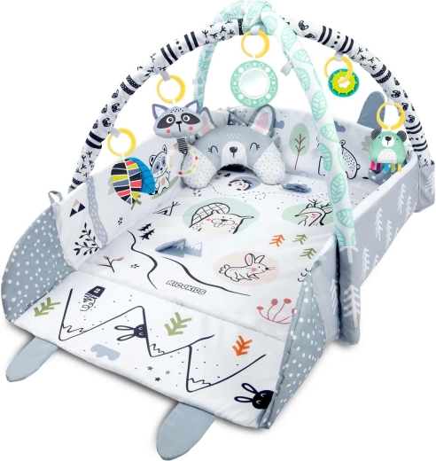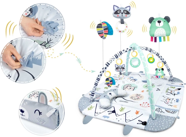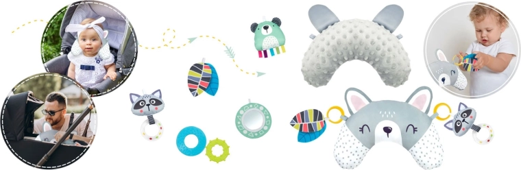 Espejo, sonajeros, elementos crujientes y con pitido, así como mordedores, desarrollan la vista, el oído y la motricidad fina. Los juguetes pueden moverse o retirarse fácilmente de los arcos.