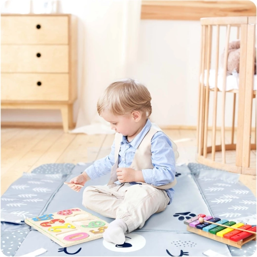 Detalles prácticos como cierres de velcro, asas intuitivas y material resistente y fácil de limpiar facilitan el uso diario. La generosa medida de 110 × 100 cm garantiza libertad de movimiento y la manta puede servir más adelante como alfombra infantil. El producto cumple con las normas EN 71 y cuenta con el marcado CE.