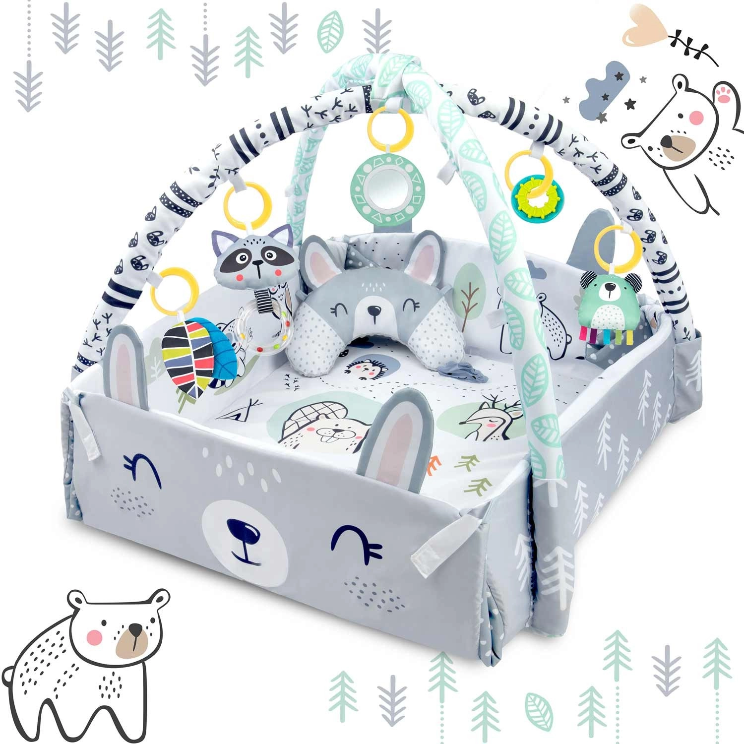Incluye 7 juguetes originales, entre ellos un espejo, sonajeros, elementos crujientes y un juguete con pitido con cintas sensoriales. Los juguetes y los arcos acolchados pueden reubicarse o retirarse con facilidad. El cojín para tummy time con lado minky suave favorece la correcta colocación y el fortalecimiento de los músculos del cuello y la espalda.