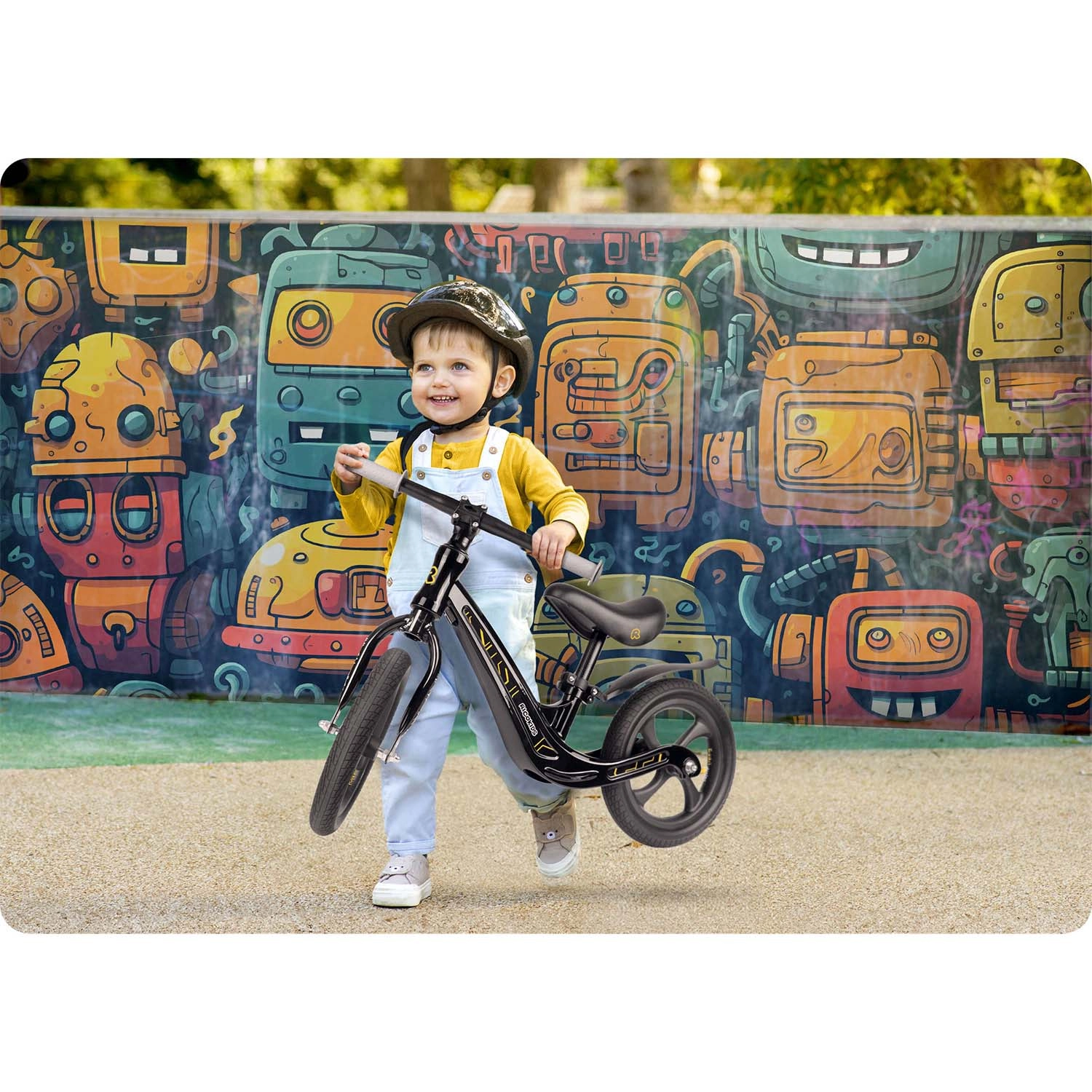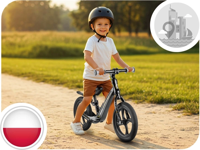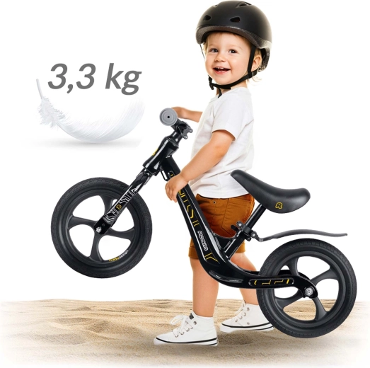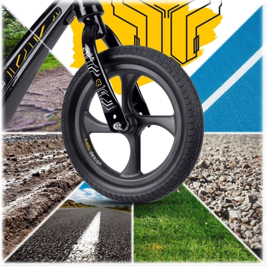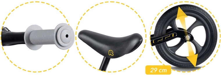 La seguridad y el control se refuerzan con puños antideslizantes con topes y una geometría estable con acceso bajo. La bicicleta es silenciosa incluso en interiores y se desenvuelve de maravilla en hierba, asfalto y grava fina. Gracias a su construcción ligera, incluso los más pequeños pueden manejarla fácilmente, y los padres aprecian su sencilla limpieza y la resistencia a la humedad y a los rayos UV.