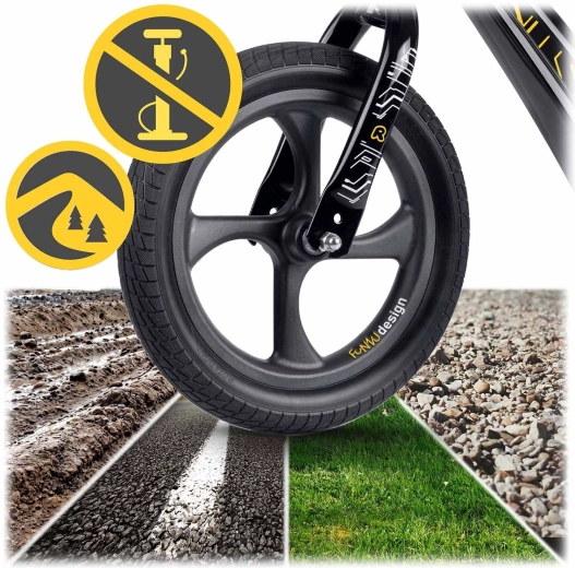 Las ruedas sin mantenimiento son silenciosas, no absorben la suciedad y resisten la humedad, la radiación UV y las bajas temperaturas. Garantizan una conducción fluida y estable en diversas superficies.