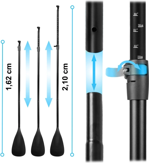 - Puesta en marcha rápida – válvula universal, inflado de doble acción y fácil ajuste de la longitud del remo con cierre de palanca.