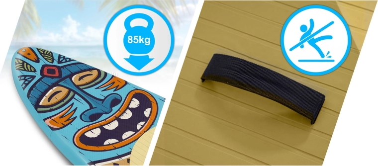 El SUP inflable Soke es la elección ideal para principiantes y jóvenes riders de hasta 85 kg que buscan estabilidad, fácil manejo y máxima portabilidad. La tabla de 275 × 76 × 12 cm con volumen de 180 l ofrece pisada segura gracias a la espuma EVA antideslizante y transporte cómodo mediante el asa central. El elástico bungee frontal sujeta tu chaqueta, botella y objetos pequeños para tener todo a mano.