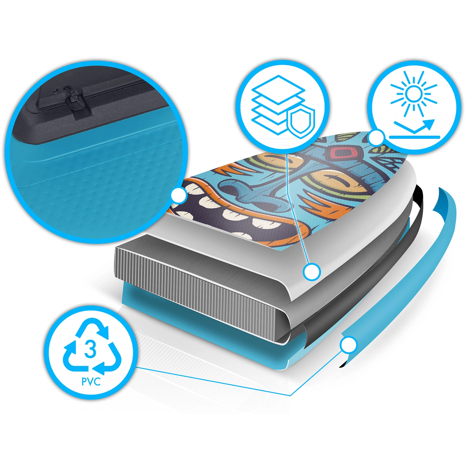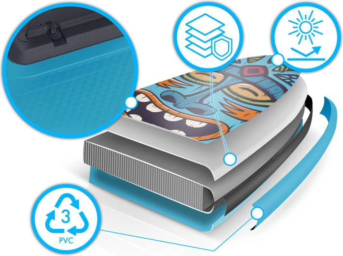 El PVC multicapa con tecnología drop-stitch light garantiza bajo peso, alta rigidez y larga vida útil, incluso con uso frecuente al sol.