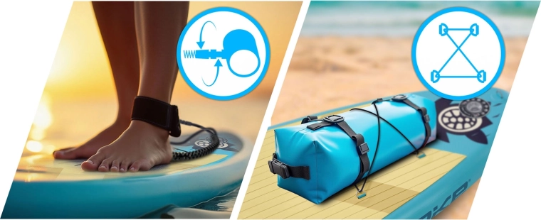 - Tabla, bomba, remo, leash, quilla desmontable, asiento, mochila, kit de reparación (parches de PVC, pegamento, llave de válvula, estuche)