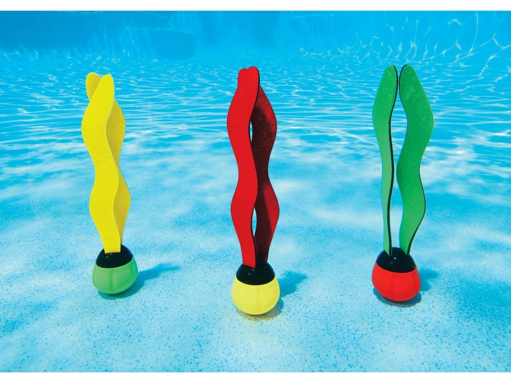 El set incluye 3 piezas en diferentes combinaciones de colores (amarillo, rojo, verde) para una mejor orientación bajo el agua. El plástico blando es agradable al tacto y resistente, mientras que las cintas textiles aumentan la visibilidad y el atractivo durante los juegos en la piscina.
