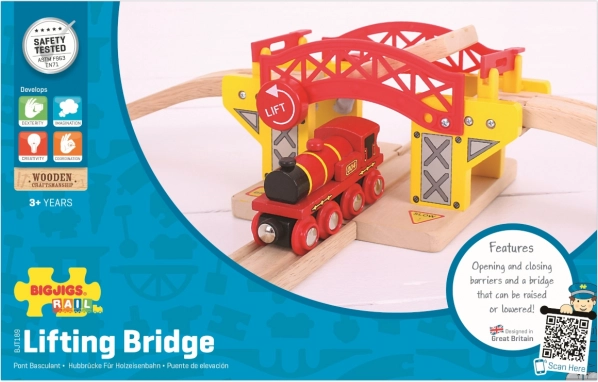 El puente levadizo de madera es el complemento perfecto para cualquier circuito de trenes. Es compatible con todos los circuitos de trenes de madera del mercado y está fabricado con materiales naturales de alta calidad y de origen responsable. Su construcción, que favorece la destreza y la coordinación, ofrece funciones realistas como el levantamiento del puente.
