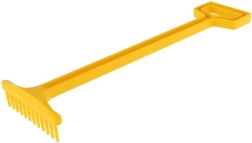 El mango largo y el extremo ergonómico garantizan una sujeción estable al rastrillar arena y hojas.