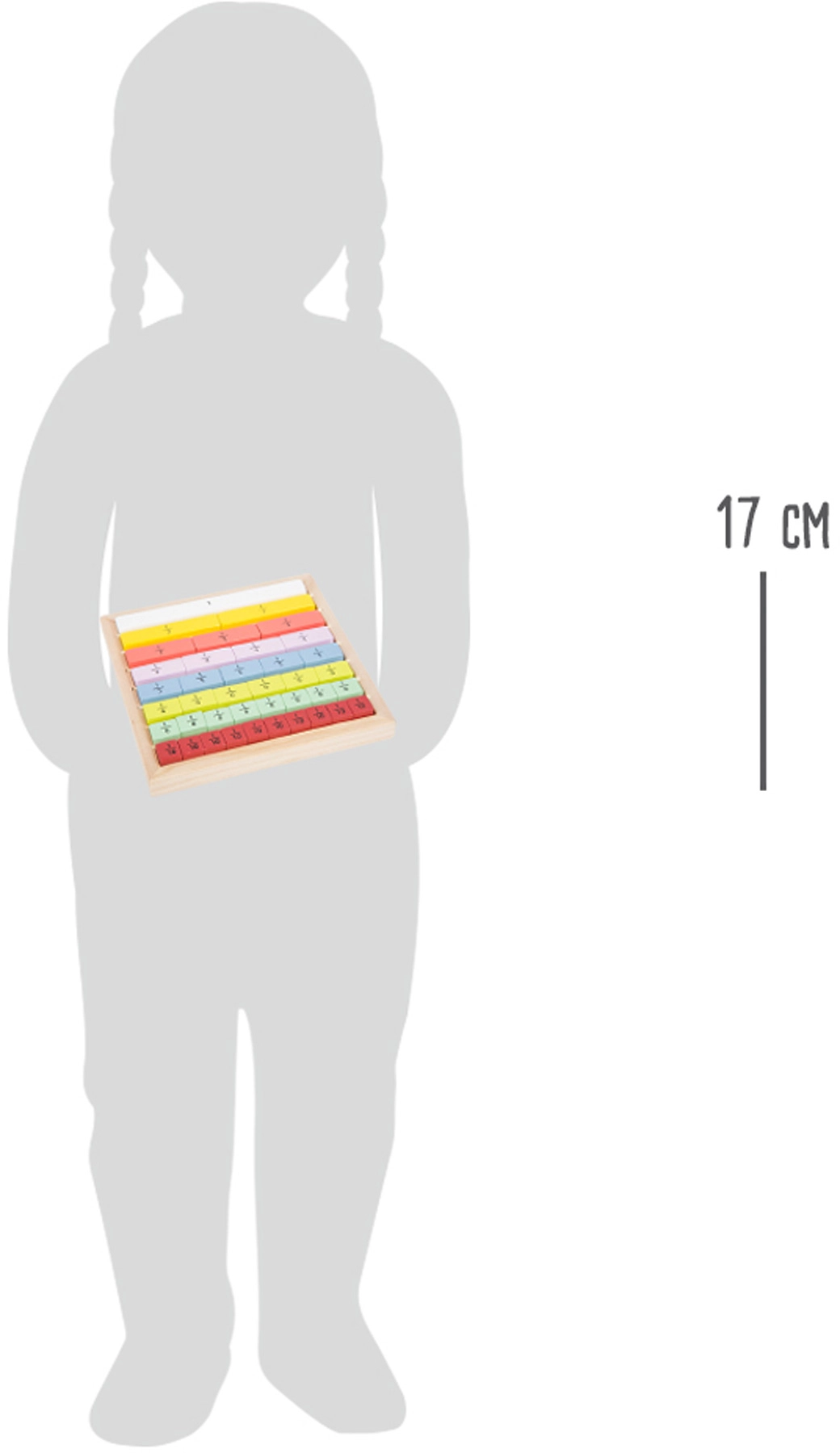 Esta herramienta educativa de alta calidad de Small Foot ofrece a los niños una forma de aprendizaje colorida y visual. 39 piezas de madera de diferentes longitudes y colores con impresión de números ayudan a comprender el principio de las fracciones y su combinación para formar un todo. Gracias a la madera robusta de fuentes 100% FSC, el juego es resistente y respetuoso con la naturaleza.