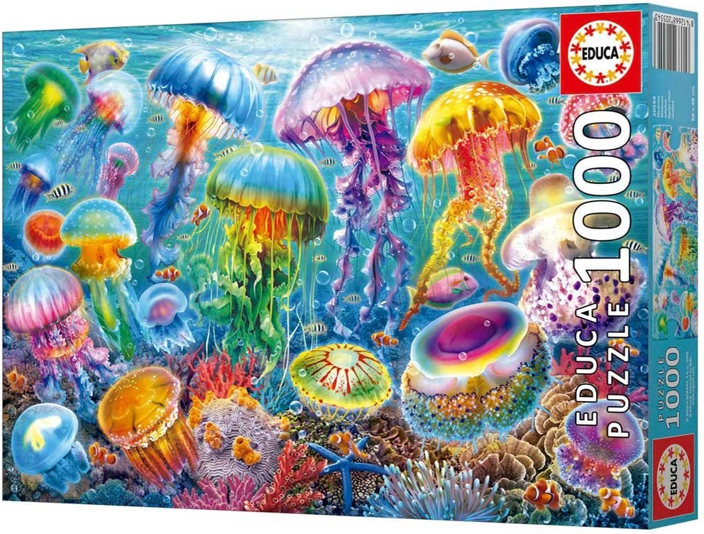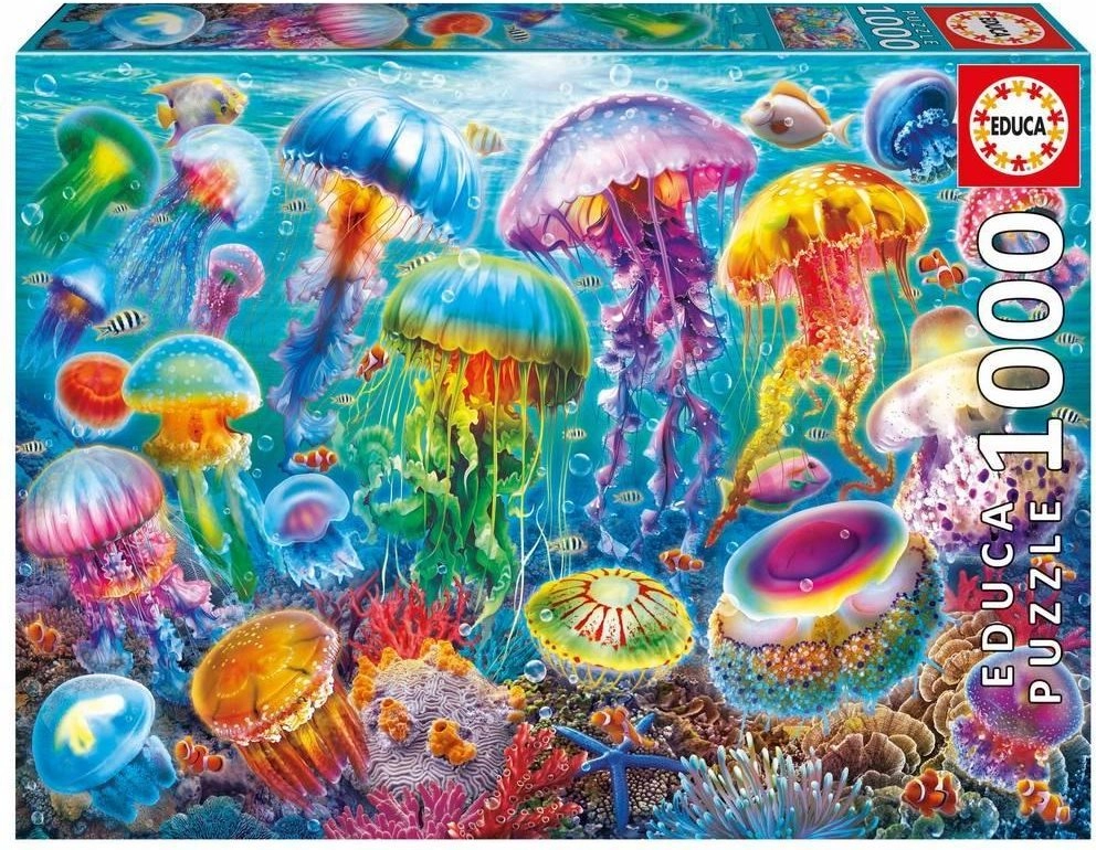 Descubre el relajante mundo de las criaturas marinas con este rompecabezas de alta calidad. Te esperan 1000 piezas con un impresionante motivo de medusas, un encaje suave y pegamento incluido gratis para fijar fácilmente la imagen terminada.