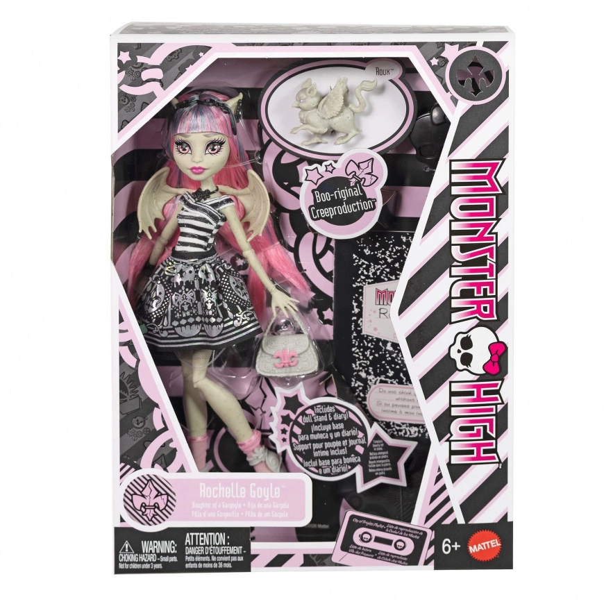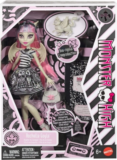 Vuelve al mundo de Monster High con el regreso del personaje de culto Rochelle Goyle. La muñeca destaca por su top a rayas en blanco y negro, minifalda metálica y acentos rosas que combinan con su largo cabello rosado. El maquillaje detallado, los accesorios y las icónicas alas completan su inconfundible estilo “de Scaris”.