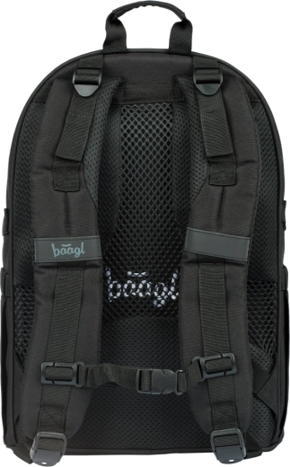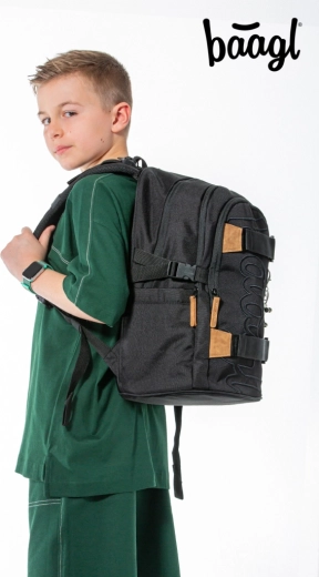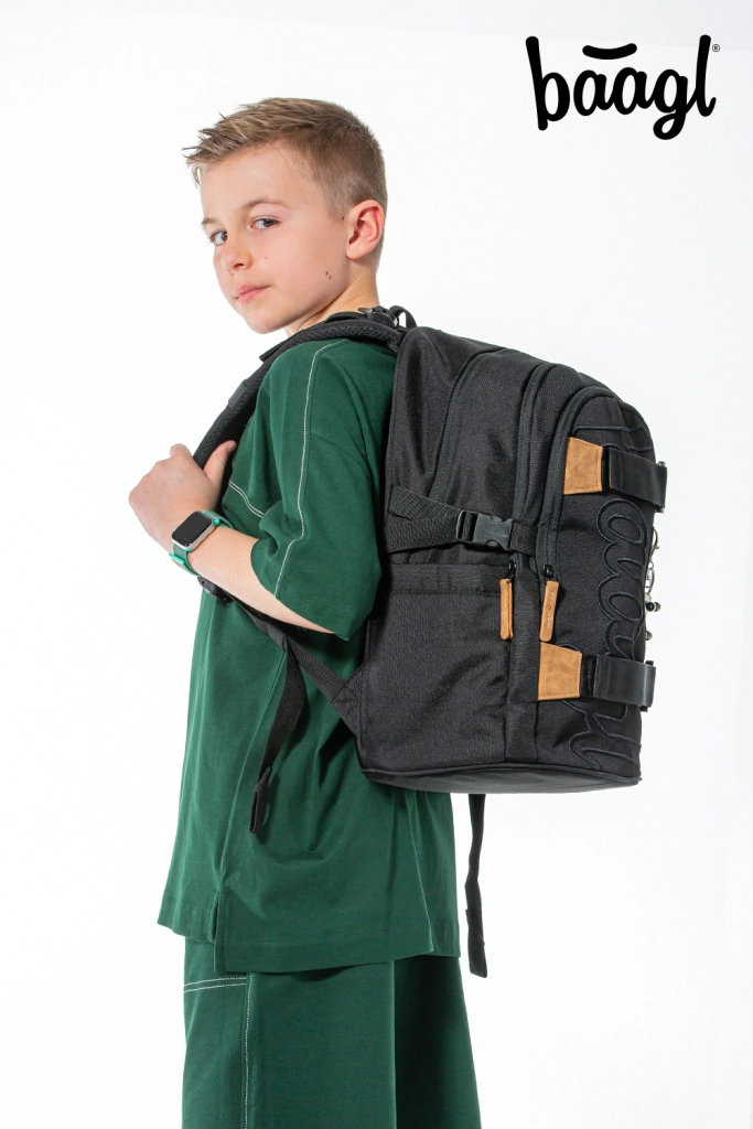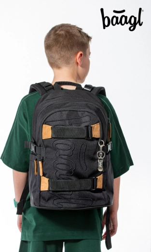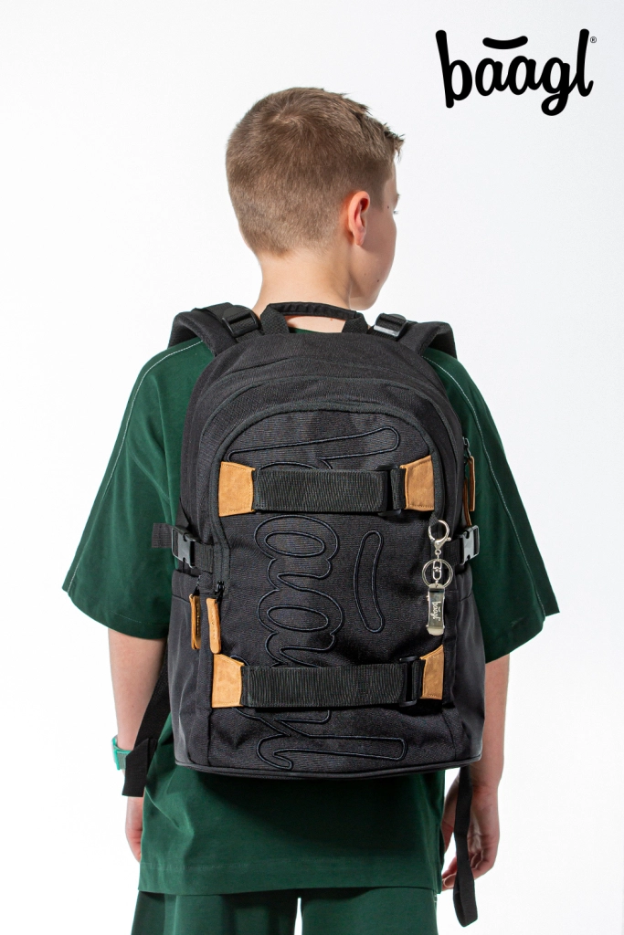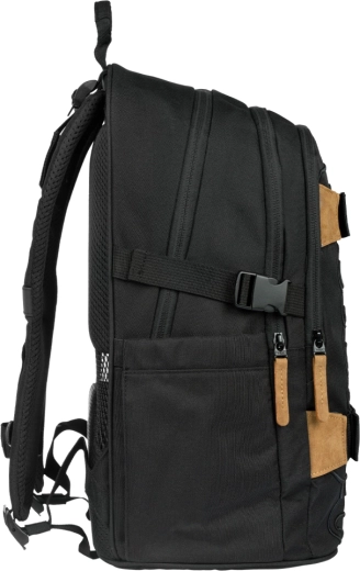 La mochila escolar SKATE DARKNESS ofrece tres compartimentos con organizador y un bolsillo acolchado para portátil o tablet de 15". Cuenta con espalda de diseño ergonómico, tirantes, correa de pecho y correas de compresión laterales totalmente ajustables, además de dos correas frontales para sujetar el monopatín. La mochila pesa solo 850 g, tiene una capacidad de 25 l y soporta hasta 7 kg. Fabricada con material reciclado resistente e impermeable, equipada con cierres YKK, complementada con elementos reflectantes y un colgante metálico con forma de skate. La serie SKATE está probada y certificada en un laboratorio acreditado.
