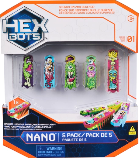 HEXBOTS Nano llevan tecnología moderna al dormitorio infantil en un formato de bolsillo. Gracias al impulso por vibración, los bichitos se agitan de forma realista y se deslizan por superficies planas, rebotan en los obstáculos y, en caso de caer de espaldas, pueden darse la vuelta solos. El Flash Nano especial es más grande, más rápido y destaca por su iluminación LED, que añade aún más acción al juego.