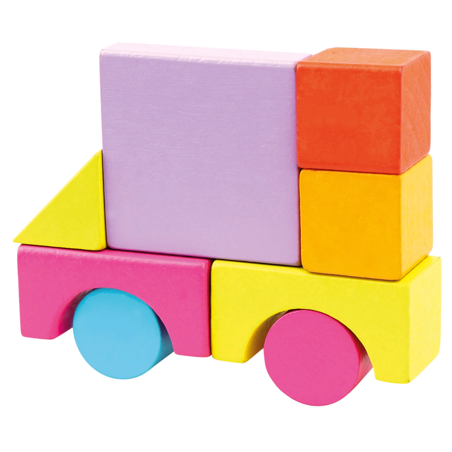 El set incluye bloques de diversas formas — cubos, prismas, cilindros, arcos y triángulos — en colores vivos que fomentan el juego creativo y abierto.