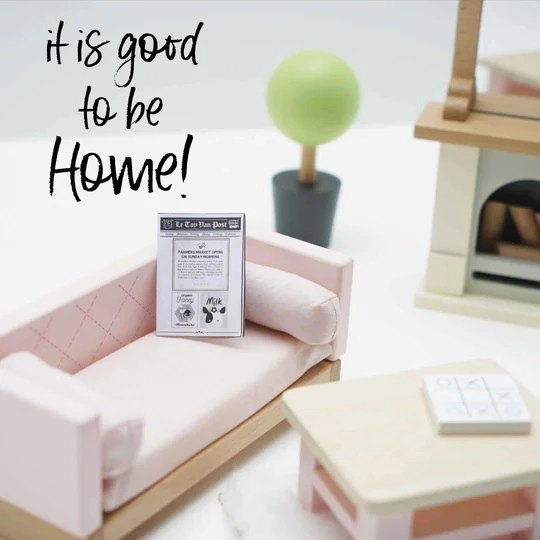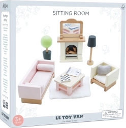 El set incluye 19 piezas: sofá y sillón con cojines de tela, mesa de centro, chimenea con leños y espejo, alfombra, planta en maceta y lámpara. Su tamaño es adecuado para las casas de muñecas de Le Toy Van. Más accesorios de la serie Daisylane están disponibles en nuestro sitio web.