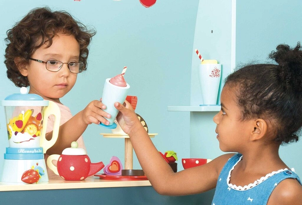 Este elegante set de madera de la colección Honeybake convierte cualquier cocina infantil en un bar de smoothies. Los niños pueden “cortar” fruta con velcro de forma segura, llenar la jarra de la licuadora y servir deliciosas bebidas en dos vasos con pajita. Los detalles realistas fomentan el juego de rol, el desarrollo de la motricidad fina y las habilidades cognitivas.