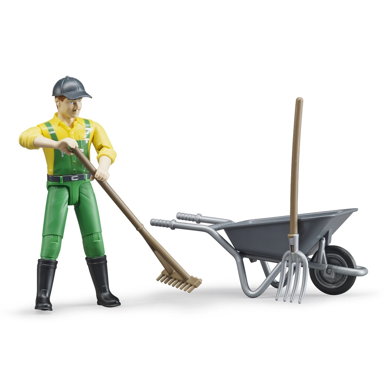 Bruder BWORLD granjero con accesorios es ideal para niños que aman descubrir la vida agrícola. La figura del granjero está equipada con extremidades articuladas, lo que le permite sostener herramientas como horquillas y rastrillos, y ofrece un juego realista y divertido.
