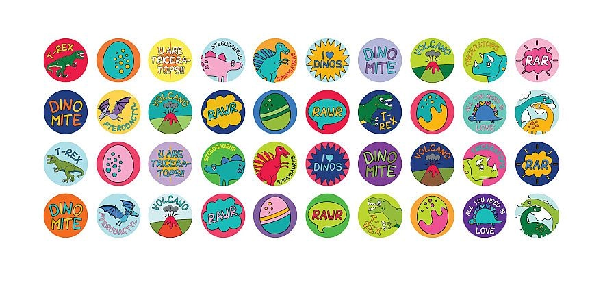El paquete incluye 160 pegatinas en el dispensador y 160 en la recarga: suficientes motivos de dinosaurios para el cole, proyectos en casa y recompensas.