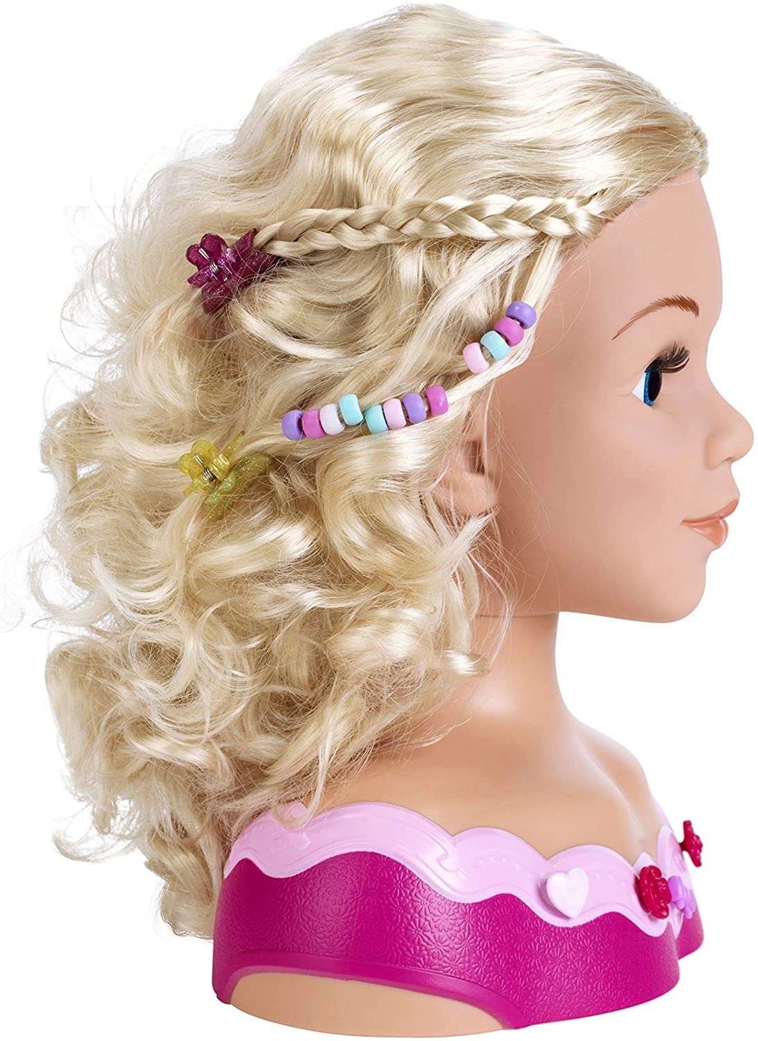 La cabeza para peinar PRINCESS CORALIE encantará a todas las pequeñas estilistas. Su cabello realista, largo y fácil de peinar, los ojos azules y la base rosa estable garantizan comodidad y diversión al crear peinados y maquillajes. El completo set con cepillo, peine, horquillas, cuentas y una paleta de maquillaje infantil abre un mundo de imaginación.