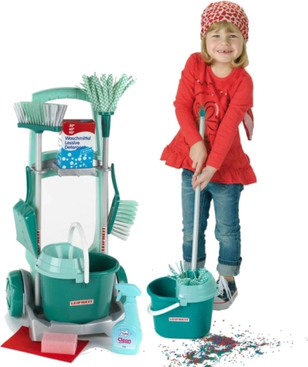 El set de limpieza infantil con licencia oficial LEIFHEIT luce como un equipo real, pero está adaptado de forma segura para pequeños ayudantes. El robusto carrito con ruedas tiene soportes para herramientas, una repisa para el cubo y espacio para la cajita de “detergente”, para que los niños se sientan como en una limpieza de verdad.