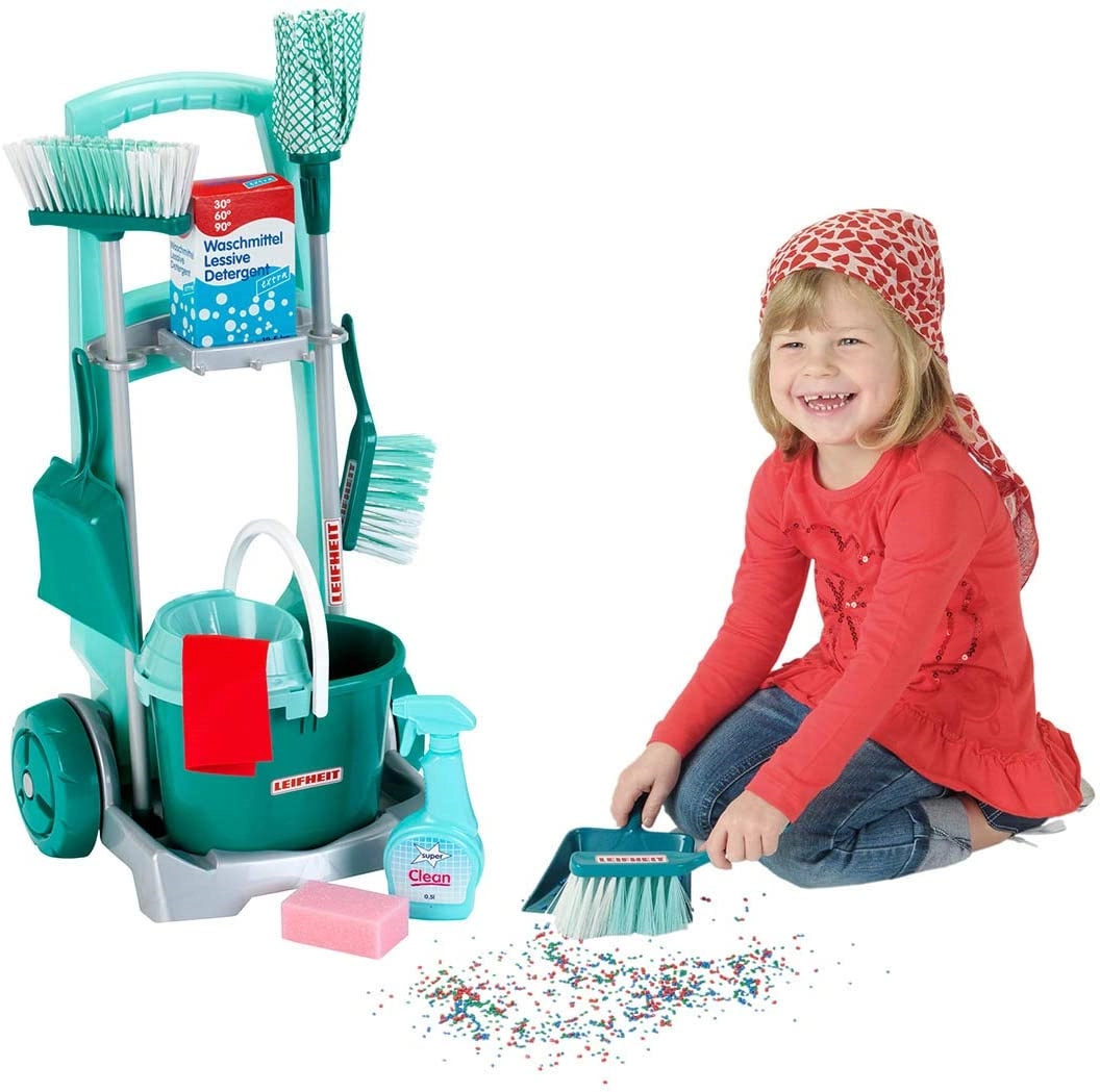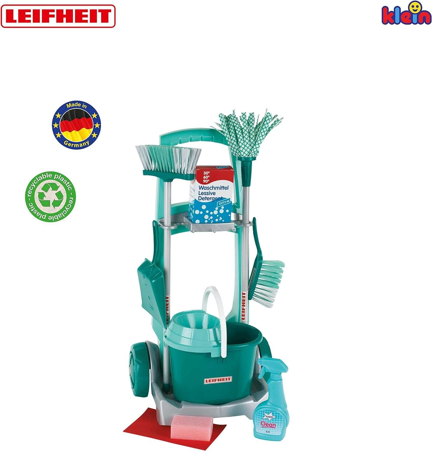 Elegante carrito de limpieza infantil con licencia LEIFHEIT de la marca KLEIN que aporta un juego doméstico realista. El set incluye un carrito con ruedas, cubo con escurridor, fregona, escoba, cepillo de mano con recogedor y otros accesorios para imitar una limpieza real. Gracias a los materiales ligeros y a los soportes bien pensados, todo es fácil de manejar y está listo para jugar. Ideal para desarrollar la motricidad, aprender responsabilidad y juego de roles creativo a partir de 3 años.