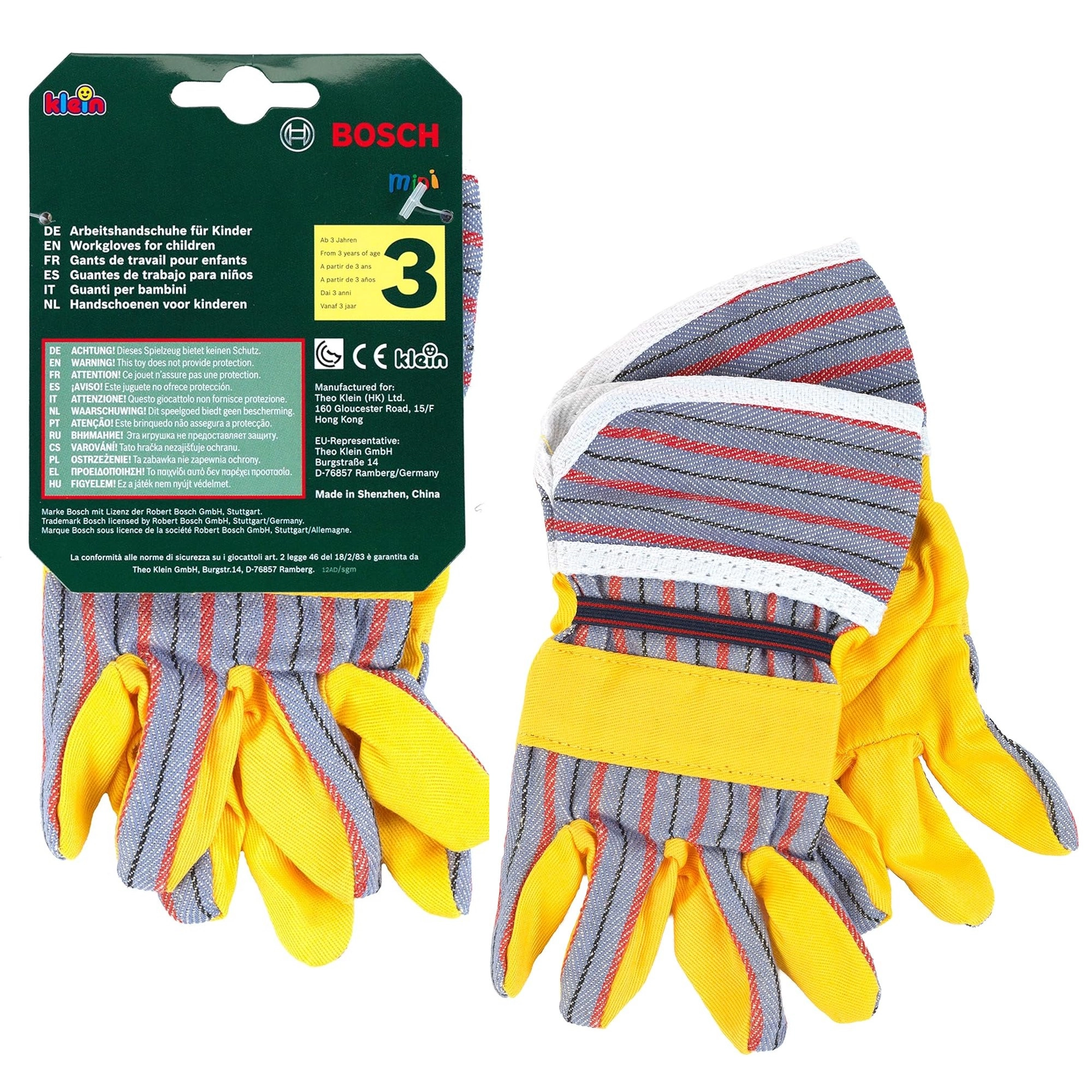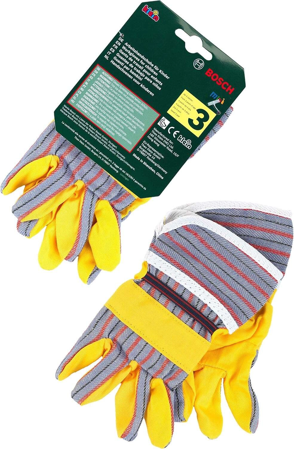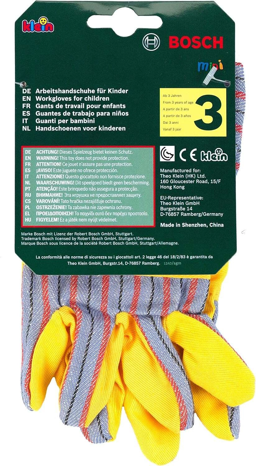 Los guantes de trabajo infantiles BOSCH de la marca Klein son un excelente complemento para pequeños manitas. Imitan fielmente los guantes reales, tienen palmas amarillas con elementos grises a rayas, puños elásticos para un mejor ajuste y son ideales para jugar a artesanos y jardineros.