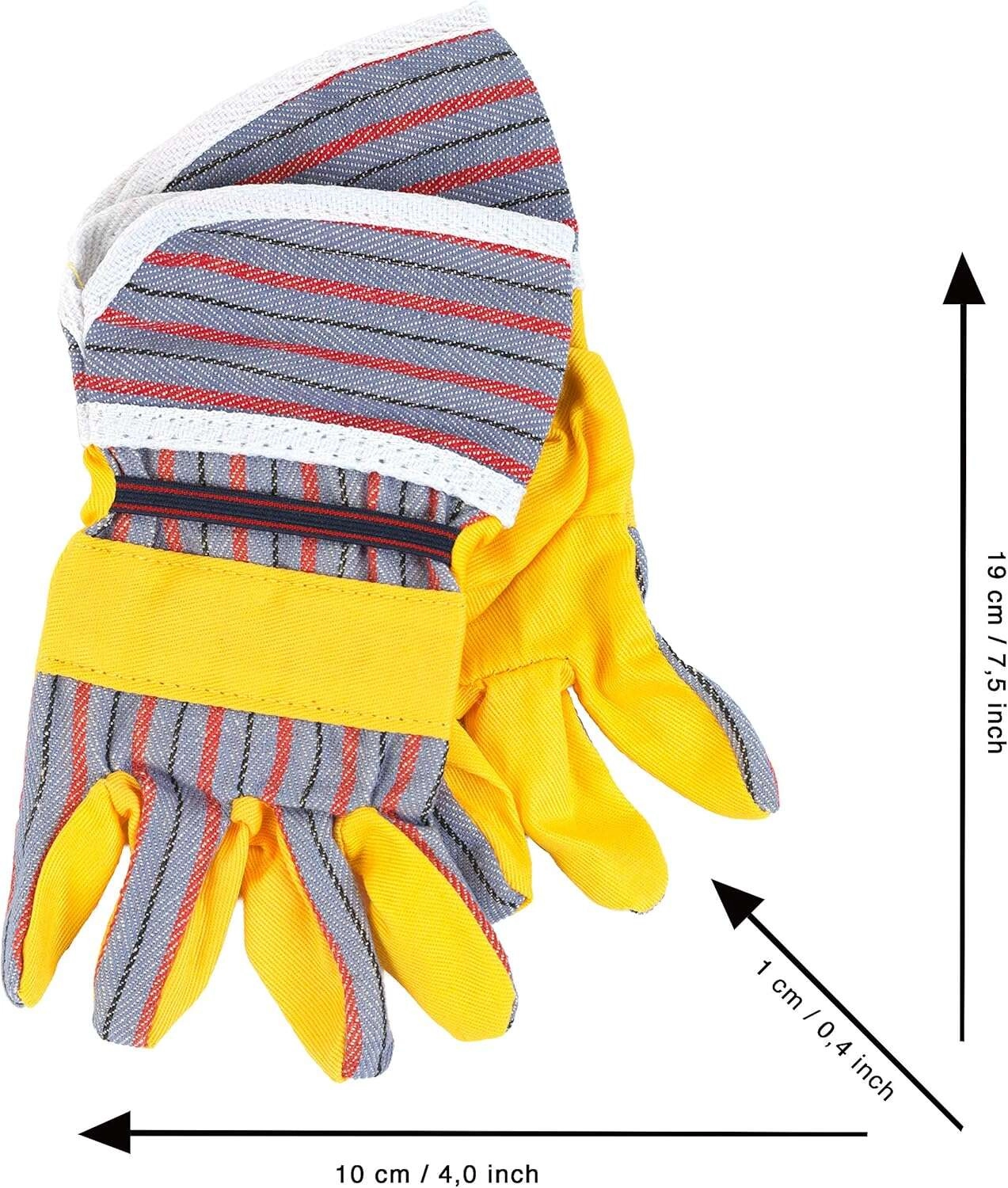 Copia fiel de guantes de trabajo con palmas amarillas y dorsos grises a rayas para un juego auténtico de pequeños artesanos.