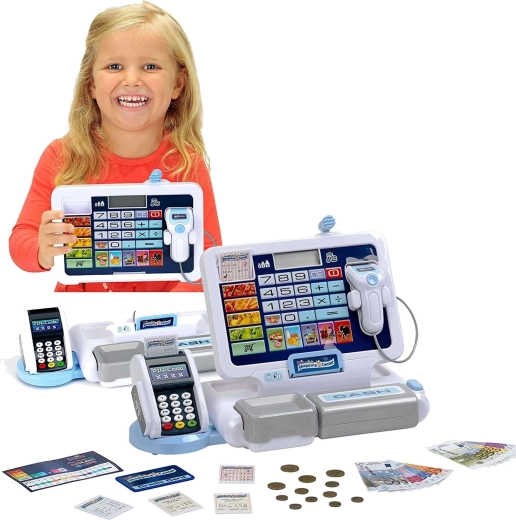 La caja registradora infantil realista con terminal y escáner de la marca KLEIN aporta un juego de tienda auténtico. Ofrece pantalla funcional con calculadora, cajón para dinero abatible, lector de tarjetas, efectos de sonido y abundantes accesorios, incluidos monedas y billetes en euros, recibos y una tarjeta “de crédito”, ideal para desarrollar cálculo, educación financiera y juego de roles.