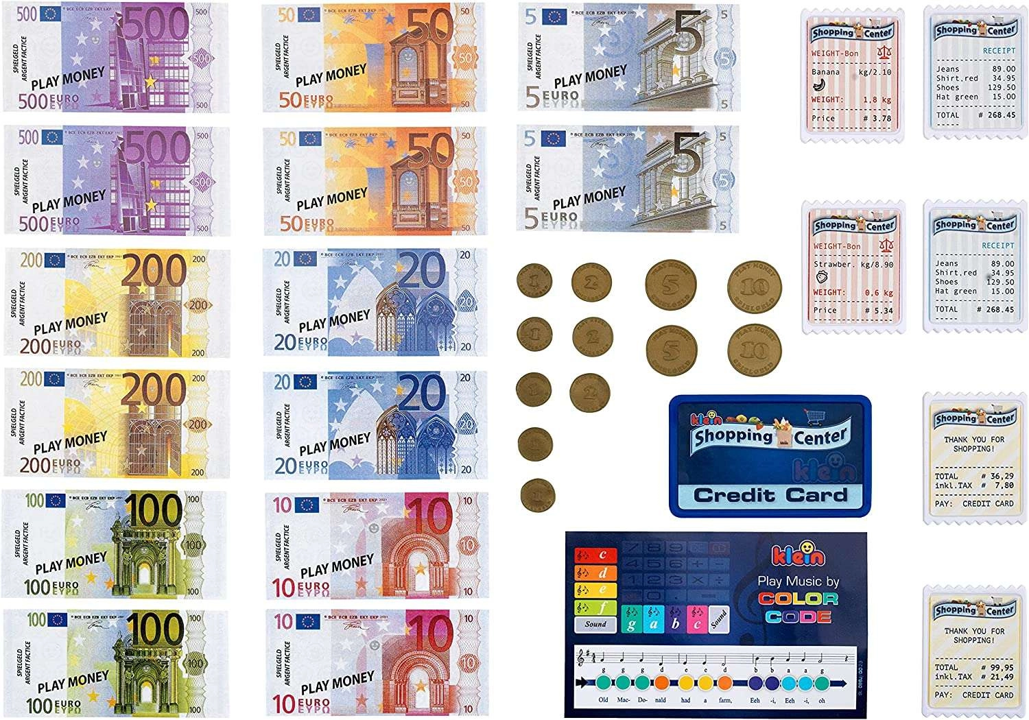 El set incluye monedas de cartón, billetes de papel, varios recibos, una tarjeta de pago y una tarjetita con canciones: todo para un juego de tienda completo.