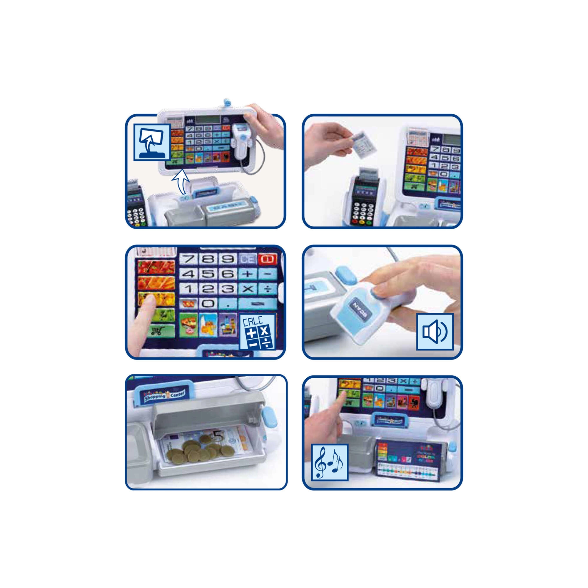 Incluye un abundante set de complementos: monedas y billetes en euros de varias denominaciones, recibos, tarjeta de pago y tarjetita con canciones para un juego aún más divertido. Es una gran opción para niños a partir de 3 años que disfrutan del juego de tienda y quieren practicar cálculo, motricidad fina y comunicación con clientes.