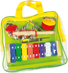 ¡Descubre el mundo de la música con el conjunto musical de la marca Bino! Este set de cuatro instrumentos es ideal para que los pequeños músicos desarrollen su talento musical, el oído y el sentido del ritmo. Incluye xilófono, castañuelas, triángulo y cascabeles, todo en una práctica bolsita para facilitar el transporte.