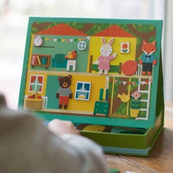 El Teatro magnético Casa de animales Petit Collage ofrece a los niños infinitas posibilidades de combinaciones y escenas: desde una acogedora casita de animales hasta un tierno picnic en el parque. Gracias a los topes, la escena magnética se monta fácilmente, convirtiendo la caja en un práctico teatrillo al instante.