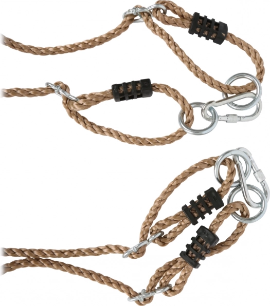 Las cuerdas de nailon con ojales metálicos, anillas y mosquetones de seguridad garantizan una suspensión rápida, firme y segura.