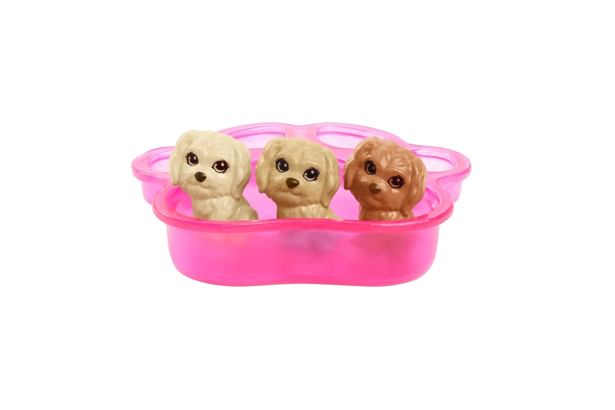 ¡Bienvenido al fascinante mundo de Barbie y la llegada de nuevos cachorritos! Este set permite a los niños ayudar a Barbie y a su perra a recibir a tres adorables cachorritos. Solo hay que presionar la espalda de la mamá perruna y los pequeños cachorritos aparecerán uno a uno. Después del nacimiento, puedes llenar la bañerita con agua fría y usar la toalla para revelar un detalle especial en cada cachorrito.