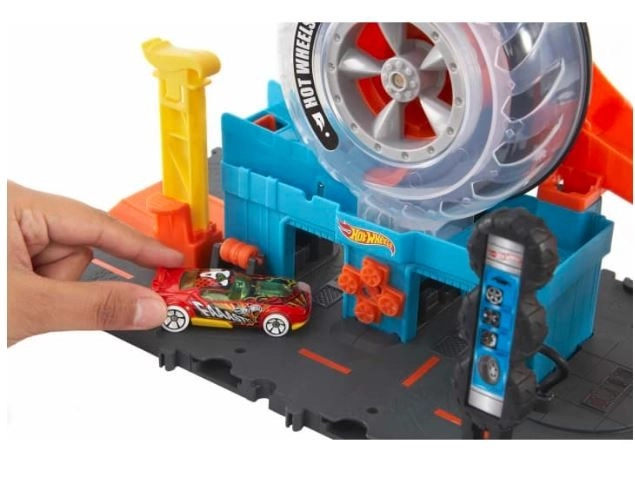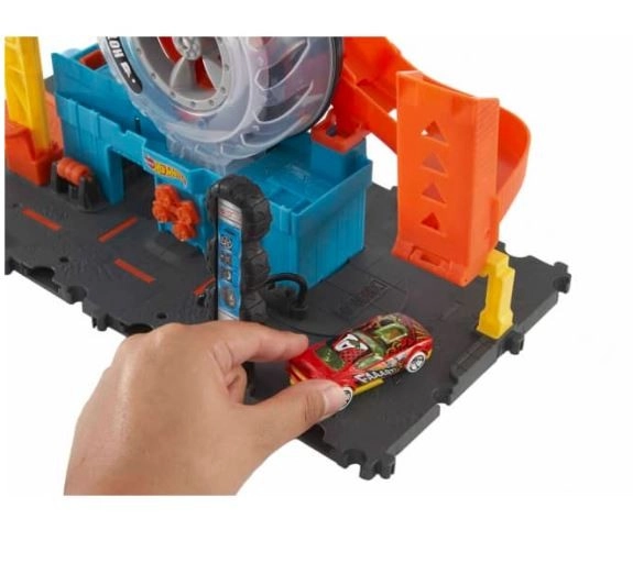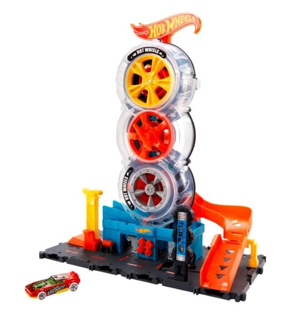 Introduce a tus hijos en el mundo de Hot Wheels, lleno de acción y creatividad. Hot Wheels Ciudad Super Twist Servicio de Neumáticos trae mucha diversión con detalles realistas, como un exhibidor giratorio de neumáticos y una llave que impulsa los coches hacia arriba por la estructura hacia nuevas aventuras.