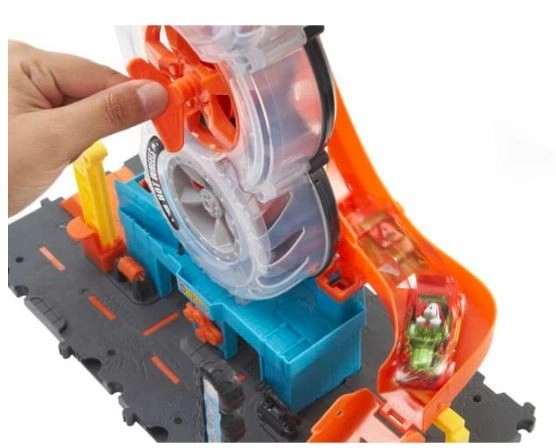 Este set de juego es totalmente compatible con otros sets de Hot Wheels, lo que permite a los niños crear su propio mundo de carreras y acrobacias. Un coche viene incluido en el paquete; sin embargo, hasta cuatro vehículos pueden girar simultáneamente dentro de la estructura de neumáticos, garantizando diversión sin fin.