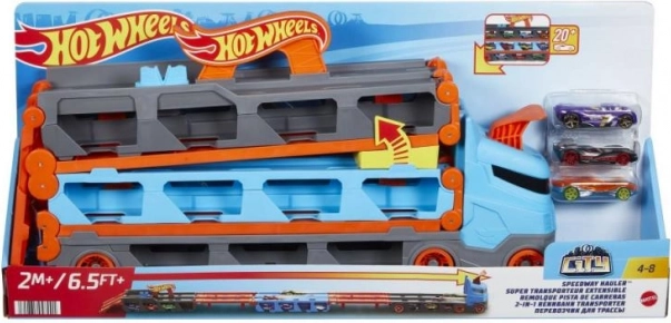 Con el transportador de carreras 2 en 1 de Hot Wheels puedes guardar y exhibir fácilmente hasta 20 cochecitos gracias a las pequeñas ventanas del remolque. Cuando llegue la hora de competir, el transportador se despliega y se convierte en una pista de carreras de 1,8 metros. Los vehículos permanecen visibles bajo la pista y la cabina del camión se transforma en un lanzador doble para dos coches.