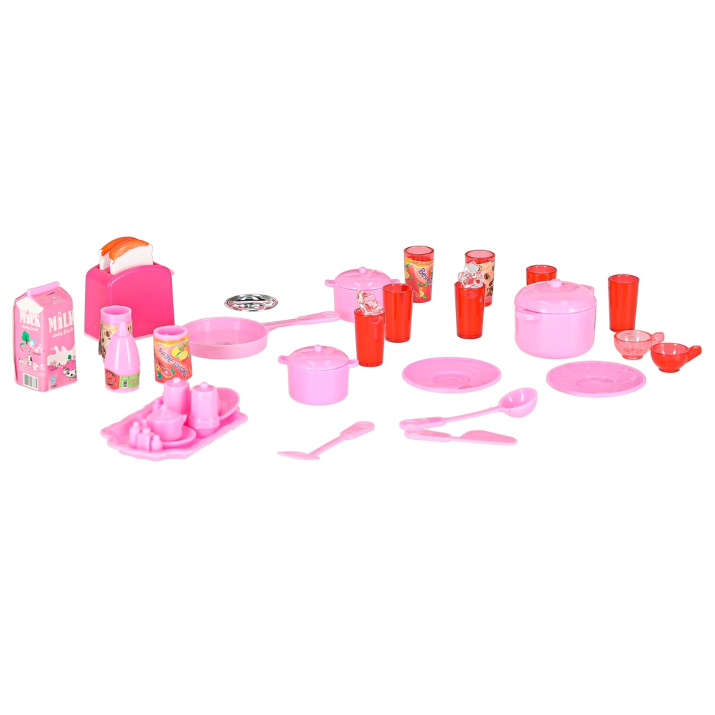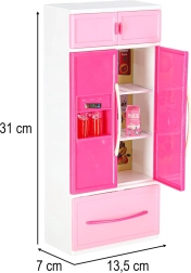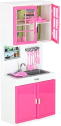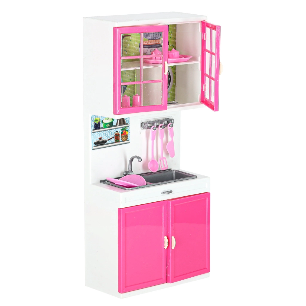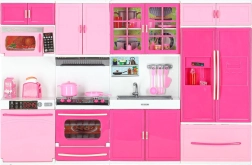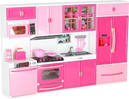 El paquete incluye una amplia gama de accesorios: ollas con tapas, sartén, tostadora con palanca móvil, vajilla, tazas, vasos, “caja de leche”, utensilios de cocina en ganchos y “cubitos de hielo”. Los armarios abatibles, el cajón extraíble y las estanterías enseñan a los niños el orden, desarrollan la motricidad fina y las habilidades sociales.