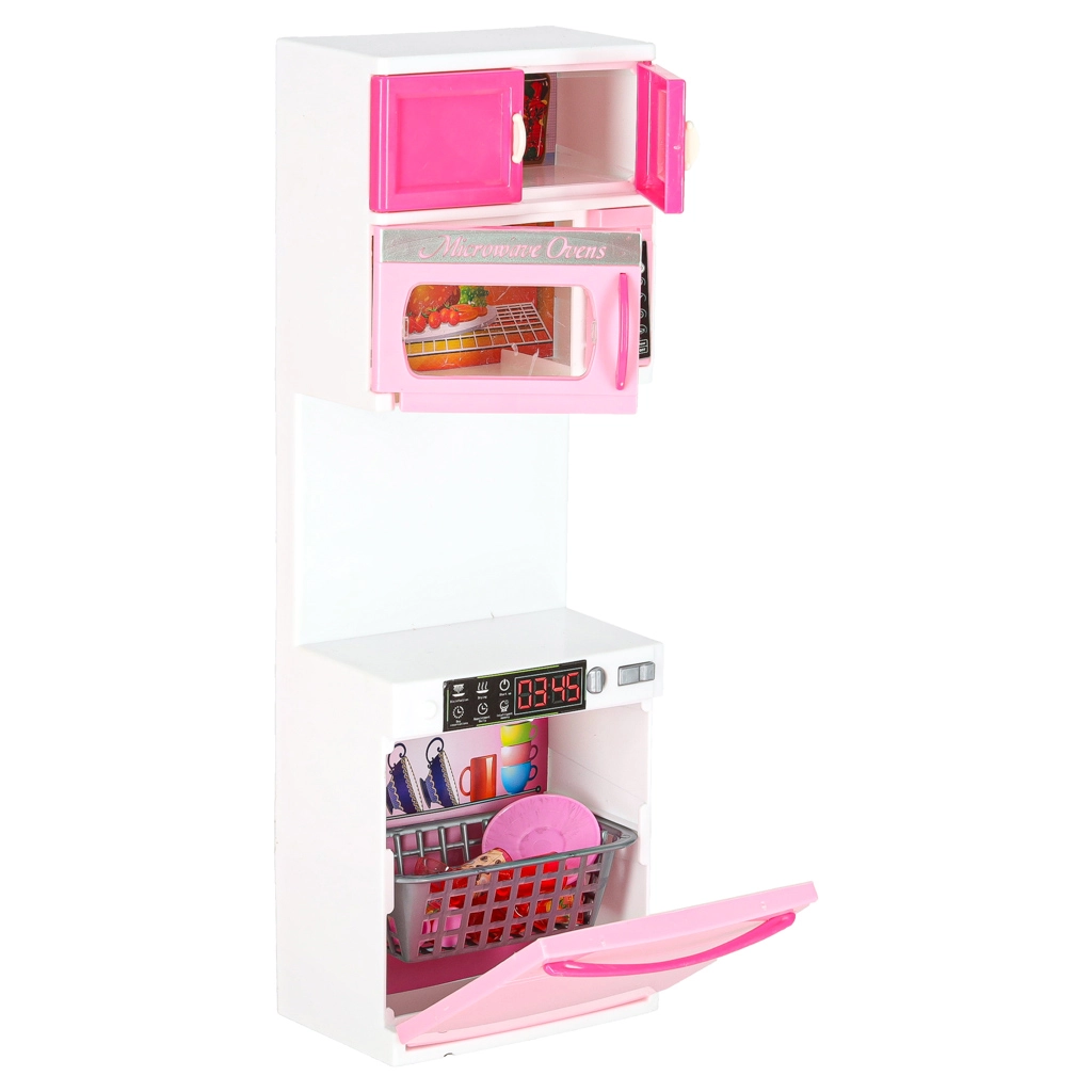 El conjunto incluye microondas y lavavajillas, placa con horno, vitrina con fregadero y una nevera con cajón. Los niños disfrutarán de un escenario completo de cocinar, hornear y limpiar.