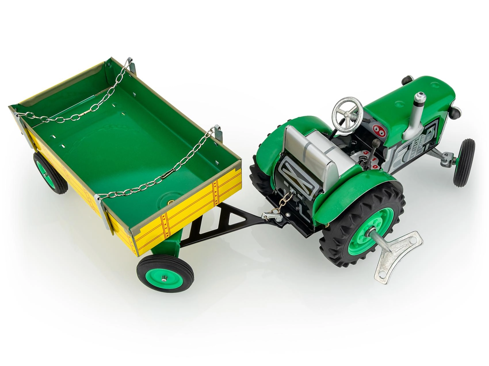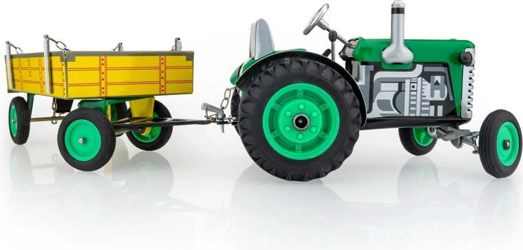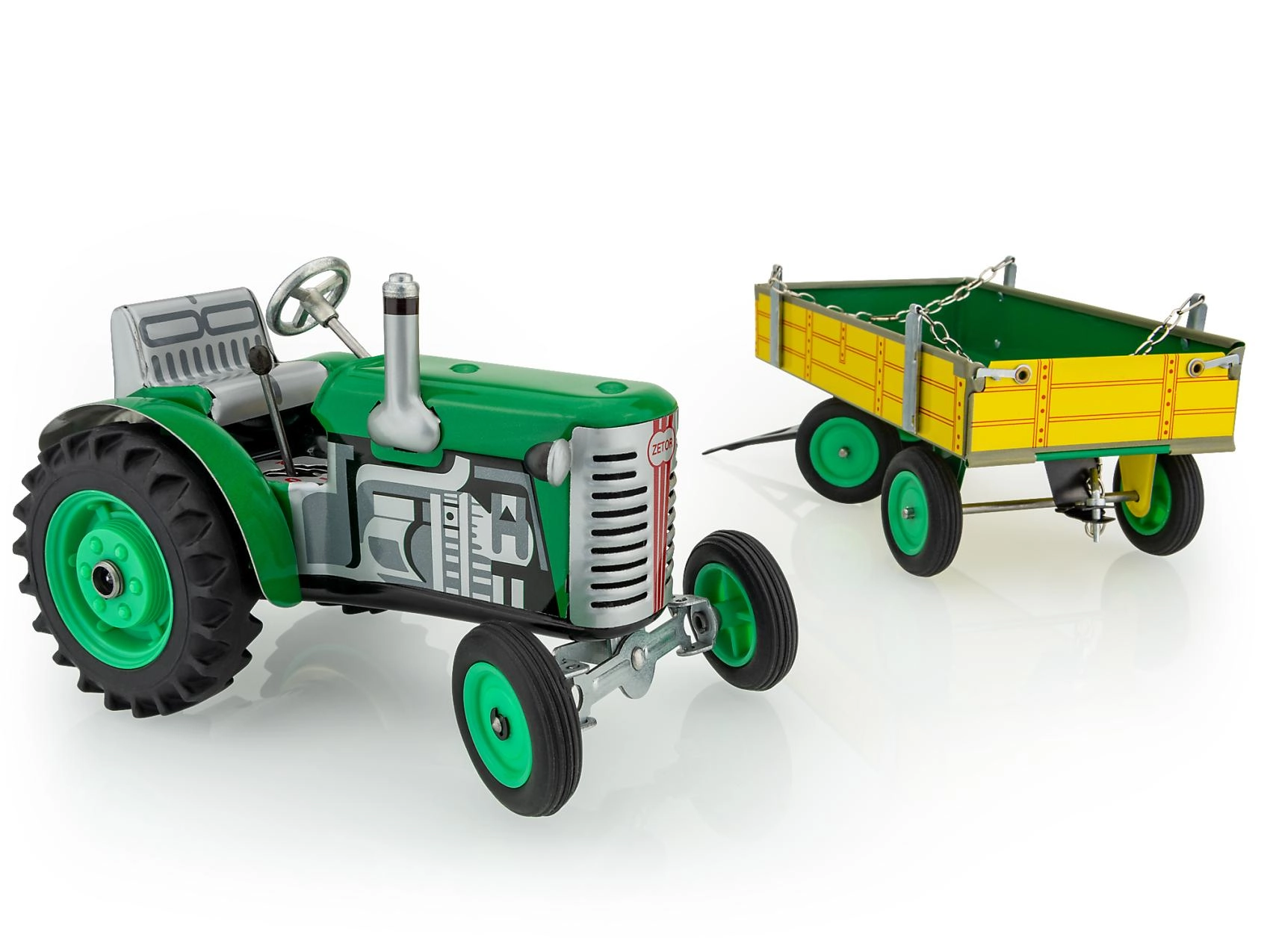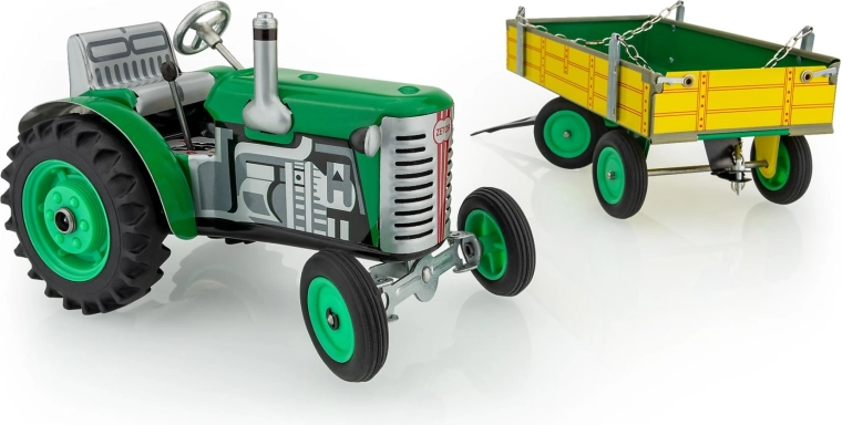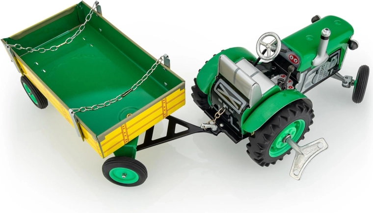 El tractor metálico Zetor con remolque de la marca KOVAP encantará a los pequeños y grandes aficionados a la maquinaria agrícola. El movimiento lo proporciona un mecanismo de cuerda con llave, incluye caja de cambios funcional con 3 marchas hacia adelante y marcha atrás, dirección con volante y freno de mano. A escala 1:25 y con una longitud de 28 cm, ofrece una experiencia de conducción auténtica y valor de coleccionista.