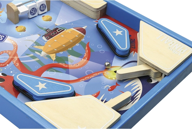 Disfruta de la diversión clásica con el gran pinball de madera VILAC con temática submarina. Construcción robusta, 3 bolas de metal, palancas sensibles y dianas con puntuación que garantizan horas de juego activo, desarrollo de la motricidad fina y de la coordinación ojo-mano. Gracias a las patas plegables ajustarás la inclinación ideal del recorrido y retarás a familia y amigos a lograr la puntuación más alta.