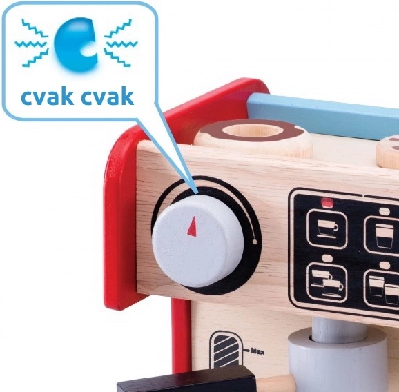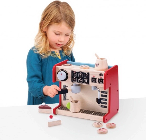 Con esta cafetera, los niños pueden probar cómo es ser barista. El set incluye una cafetera con palanca extraíble y un dispensador de leche móvil. Todo se complementa con una pantalla de control con una perilla giratoria que hace clic y botones pintados.