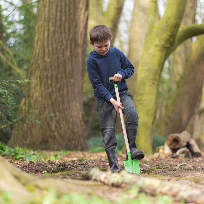 El asta de madera natural, lisa y resistente, se sujeta cómodamente y ayuda a los niños a cavar con seguridad y menos fatiga.