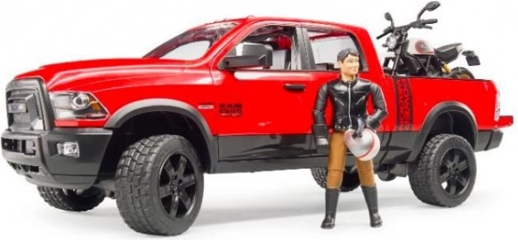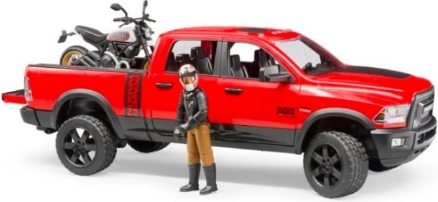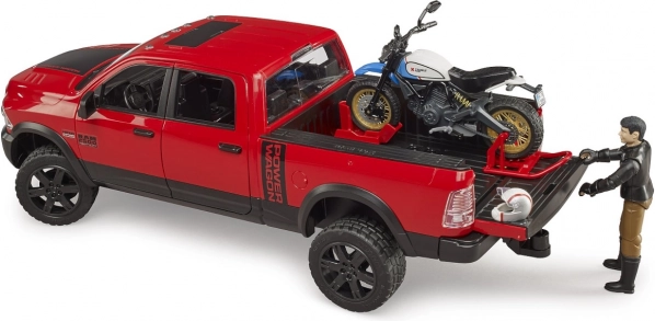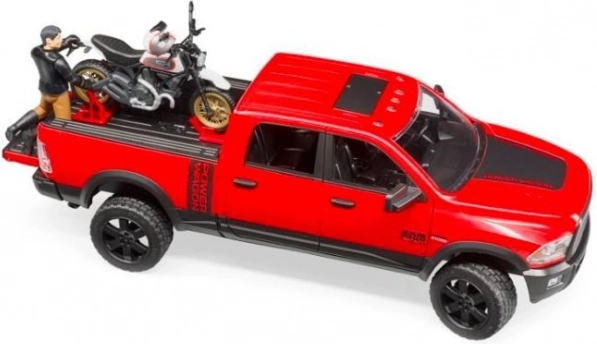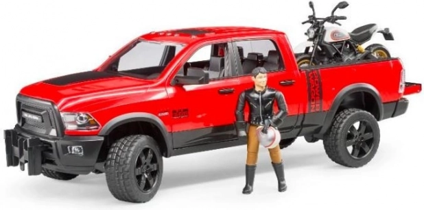 - pick-up Ram, motocicleta Ducati Scrambler, figura del conductor