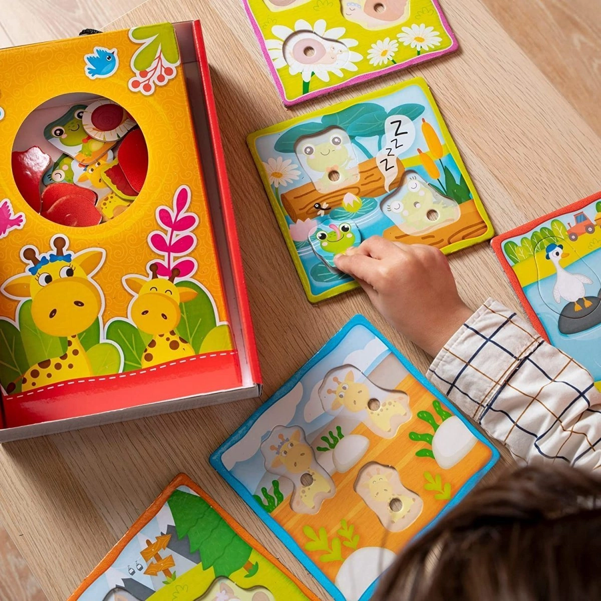 Descubra un set didáctico lúdico en el que los niños emparejan las crías con su mamá y su papá, conocen a los animales y su entorno natural y, al mismo tiempo, entrenan la paciencia, la atención y la motricidad fina. El set está diseñado para los más pequeños: las sencillas piezas de contorno se agarran bien y se encajan con facilidad.