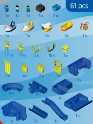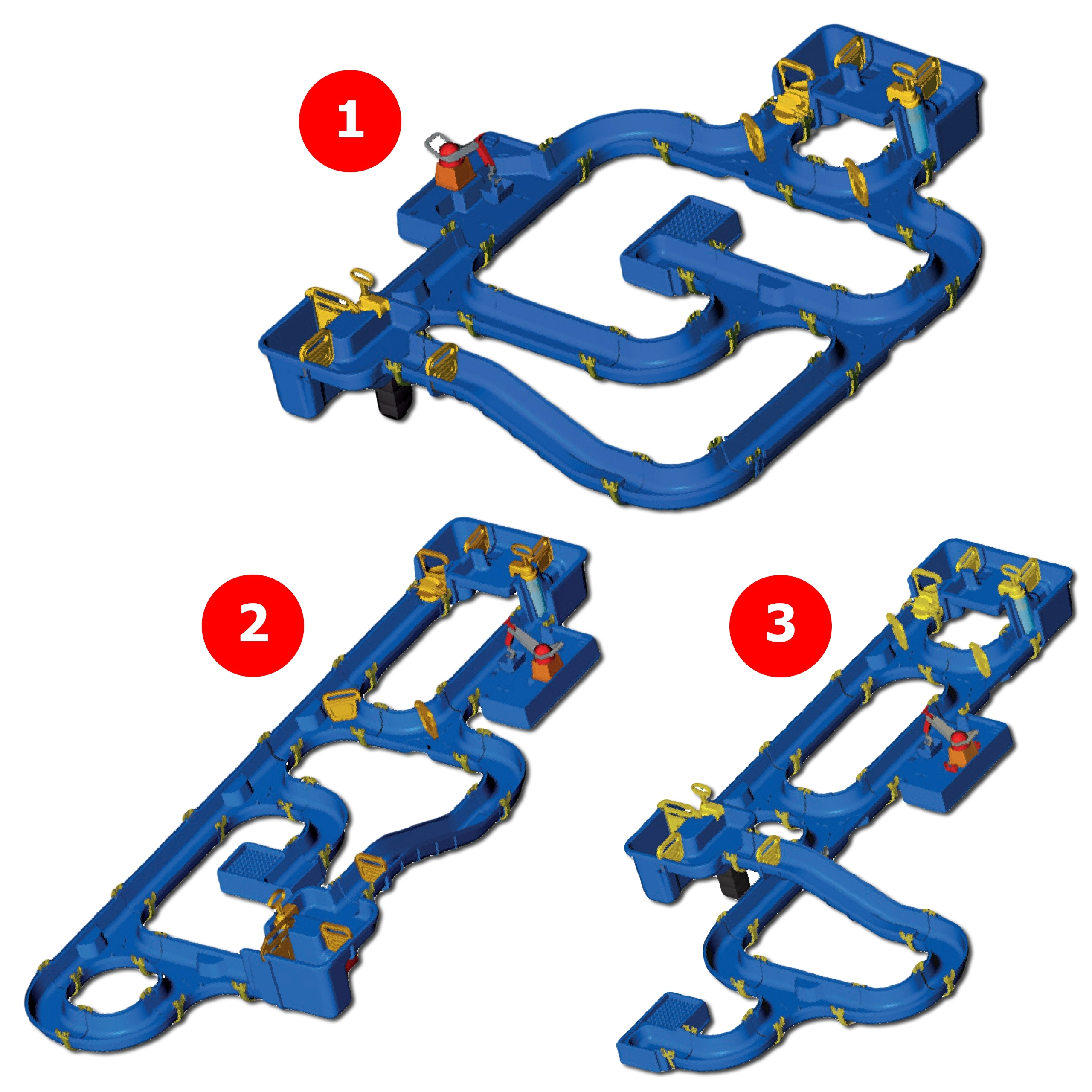 Incluye compuertas, rueda hidráulica, puerto y bombas para juegos acuáticos variados.