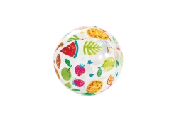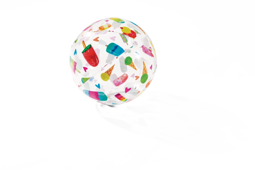 La pelota transparente está decorada con coloridos estampados de frutas, helados, peces y motivos marinos. El motivo se elige de forma aleatoria, pero siempre garantiza un aspecto alegre y buena visibilidad en el agua y en la playa.