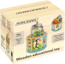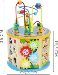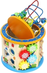 Este cubo interactivo de madera combina aprendizaje y diversión en uno. El niño practicará el conteo, el reconocimiento de colores y formas, la orientación temporal con el reloj y la coordinación ojo–mano gracias al laberinto de cuentas y a los elementos móviles. Sus caras alegremente ilustradas y la sólida fabricación en madera fomentan la creatividad y un juego seguro.